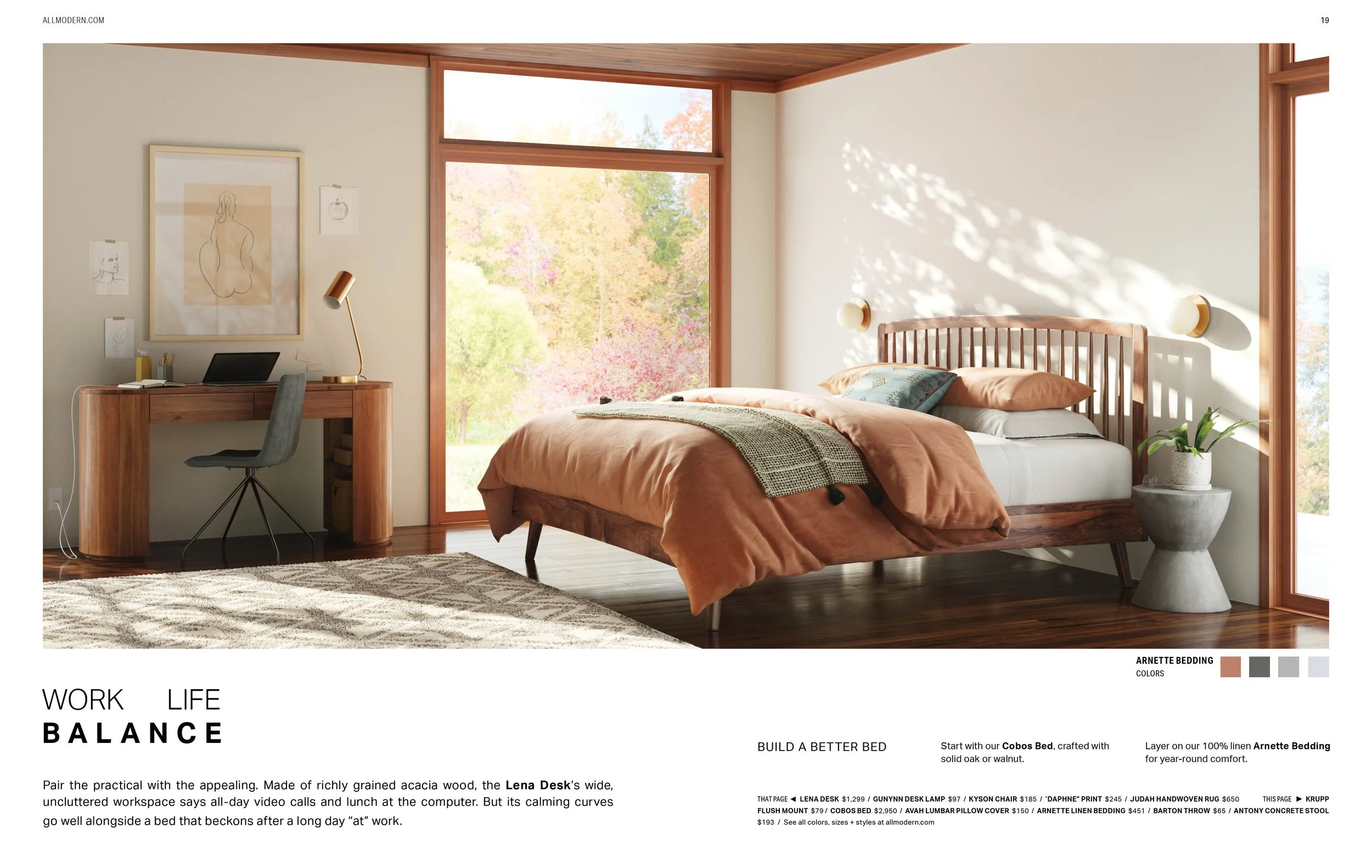 As the ACD and creative lead, I architected the foundational brand voice and messaging strategy for the revival of Wayfair's catalog program. I drove the creative vision for the AllModern catalog to ensure it aligned with the new specialty positioning and then codified that work into the scalable playbook that became the standard for all print channels across the Wayfair portfolio.